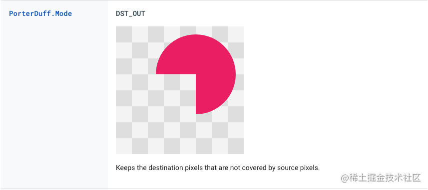 这里放大了整个View,也是为了更加直观的看到椭圆的变化。看到这里就可以明白张弦月其实就是这个椭圆和下弦月叠放在一起的效果,那残月是如何实现的呢,这里用到了PorterDuffXfermode,对于PorterDuffXfermode不了解的可以看下Google的官方文档,文章中用到的是DST_OUT,效果如图: